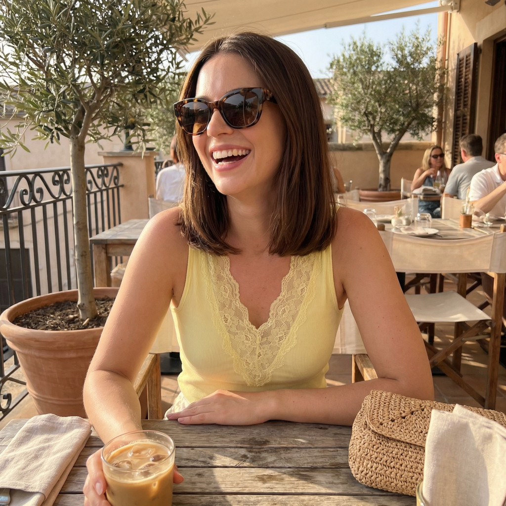 A finoman bordázott anyag és a csipkés V-kivágás együtt egy nagyon nőies, mégis letisztult hatást ad – pont az a stílus, ami egyszerre kényelmes és elegáns.