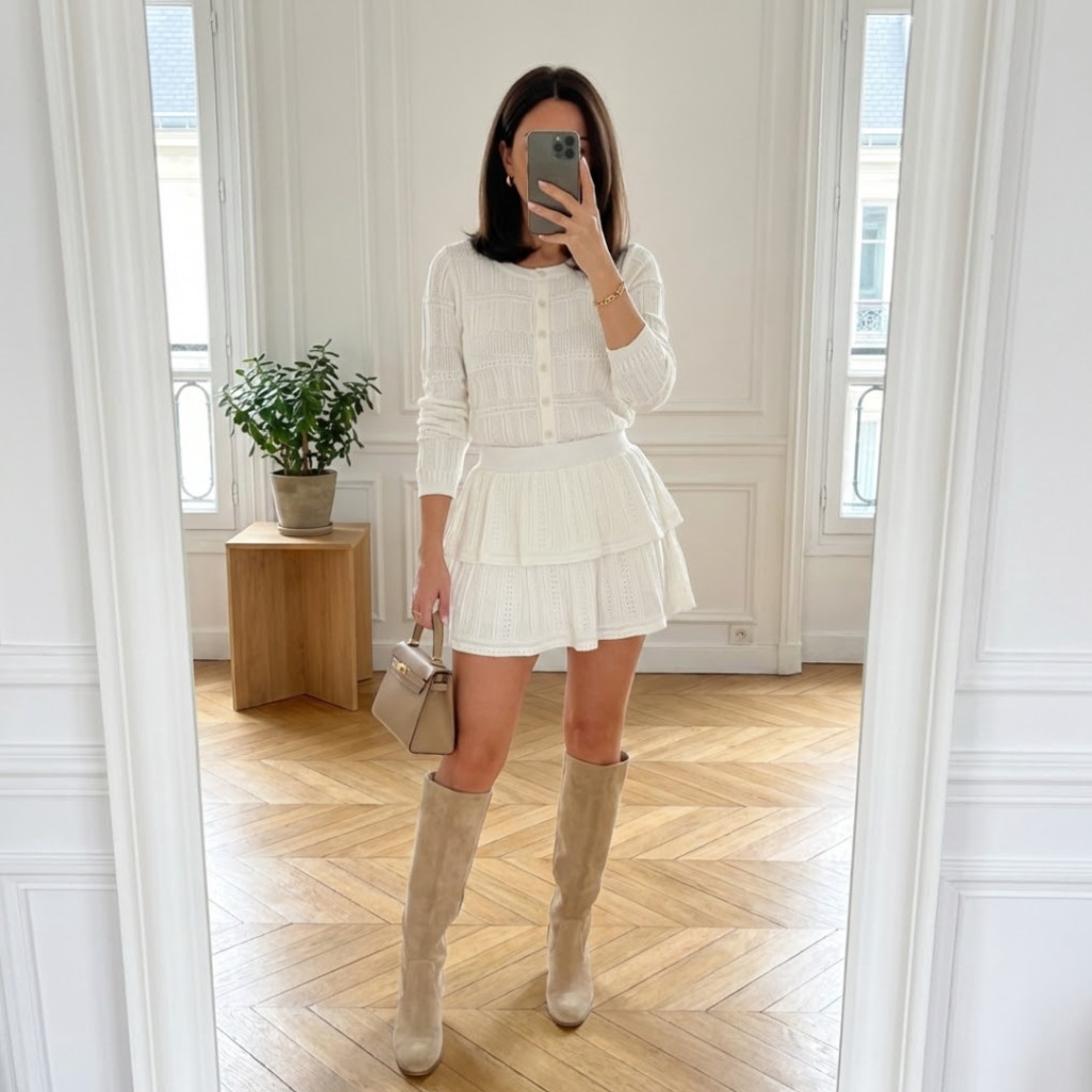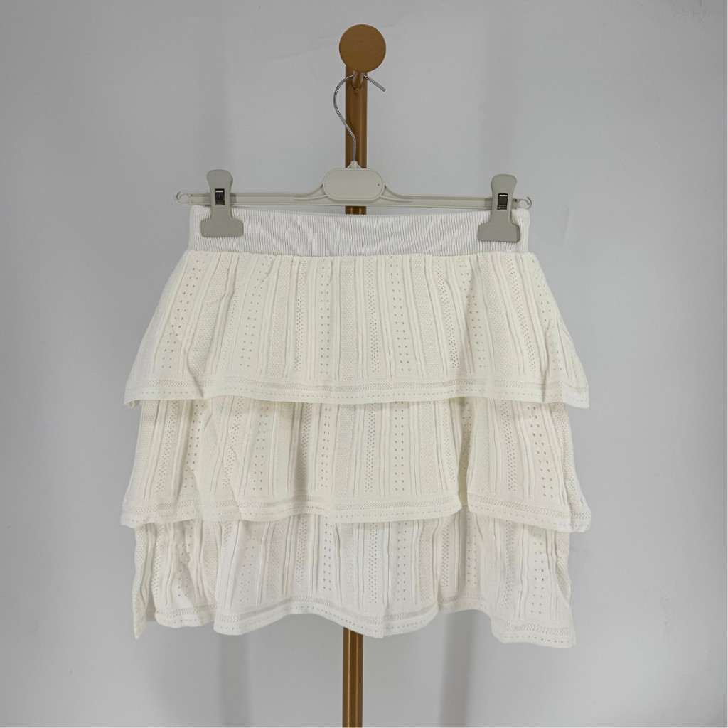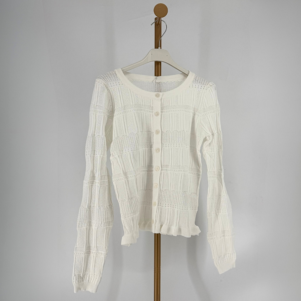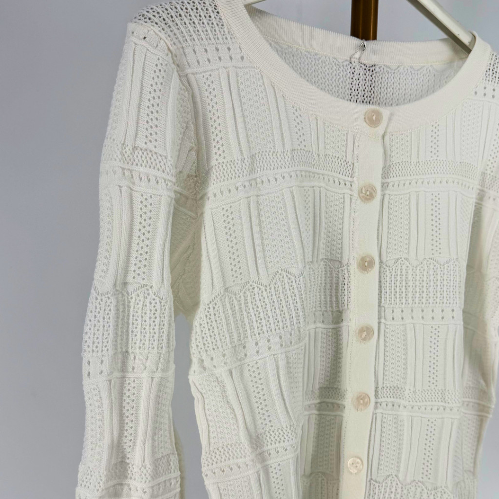 Ez a kötött szett tökéletes választás, ha egyszerre szeretnél nőies megjelenést és kényelmes viseletet. A felsőrész egy enyhén lyukacsos, áttetsző kardigán, amely könnyed réteget ad az összhatáshoz, míg a szoknyarész sűrűbb kötésű, így nem látszik át.