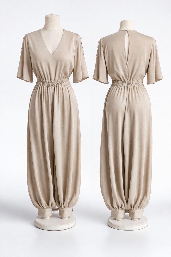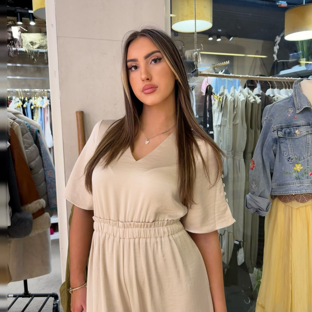 Ez az overál a letisztult, nőies vonalvezetés és a modern szabás tökéletes kombinációja. A V-kivágás finoman nyújtja az alakot, míg a gumis derékrész szépen kiemeli a derekat és kényelmes illeszkedést biztosít egész nap.