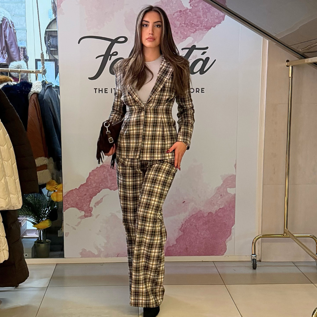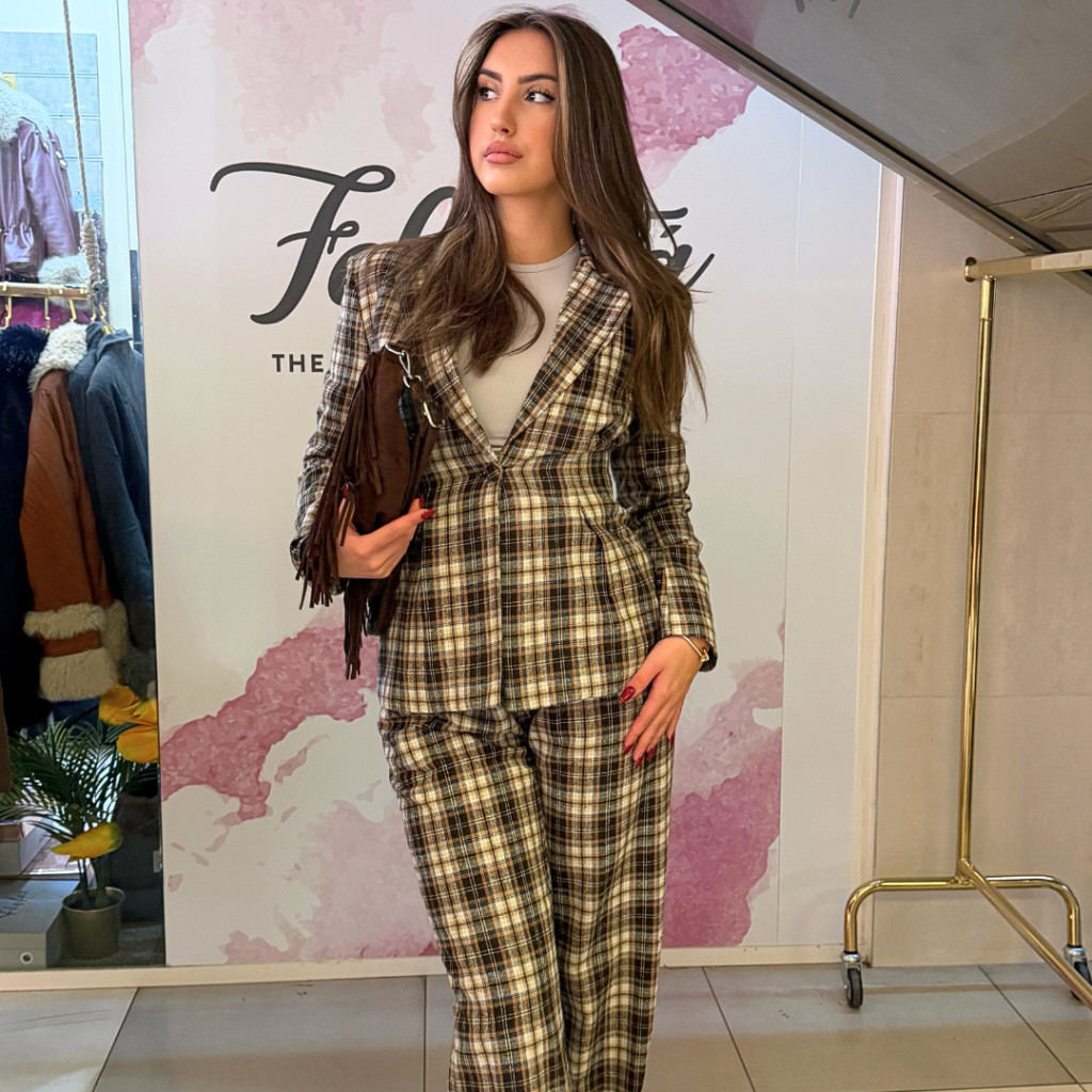 Ez a kockás blézer–nadrág szett tökéletes választás azoknak, akik szeretik a klasszikus mintákat modern, nőies szabásvonallal ötvözve. A kockás minta időtálló, mégis trendi, könnyedén feldobja a mindennapi és elegánsabb szetteket is.