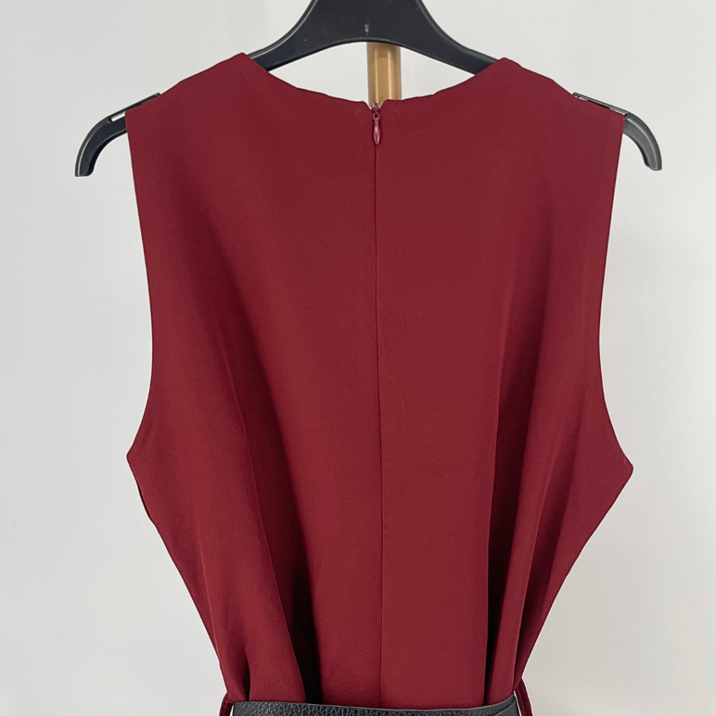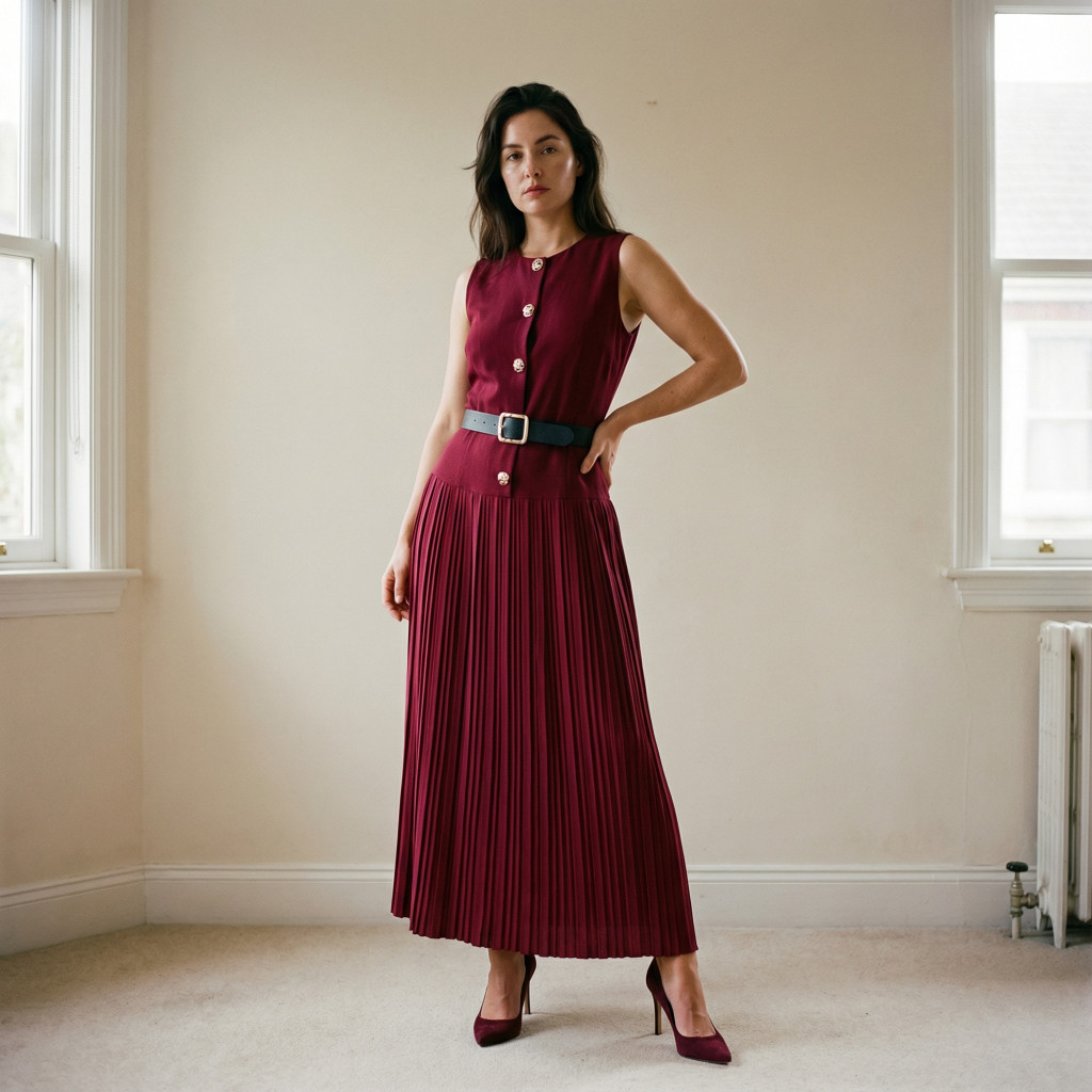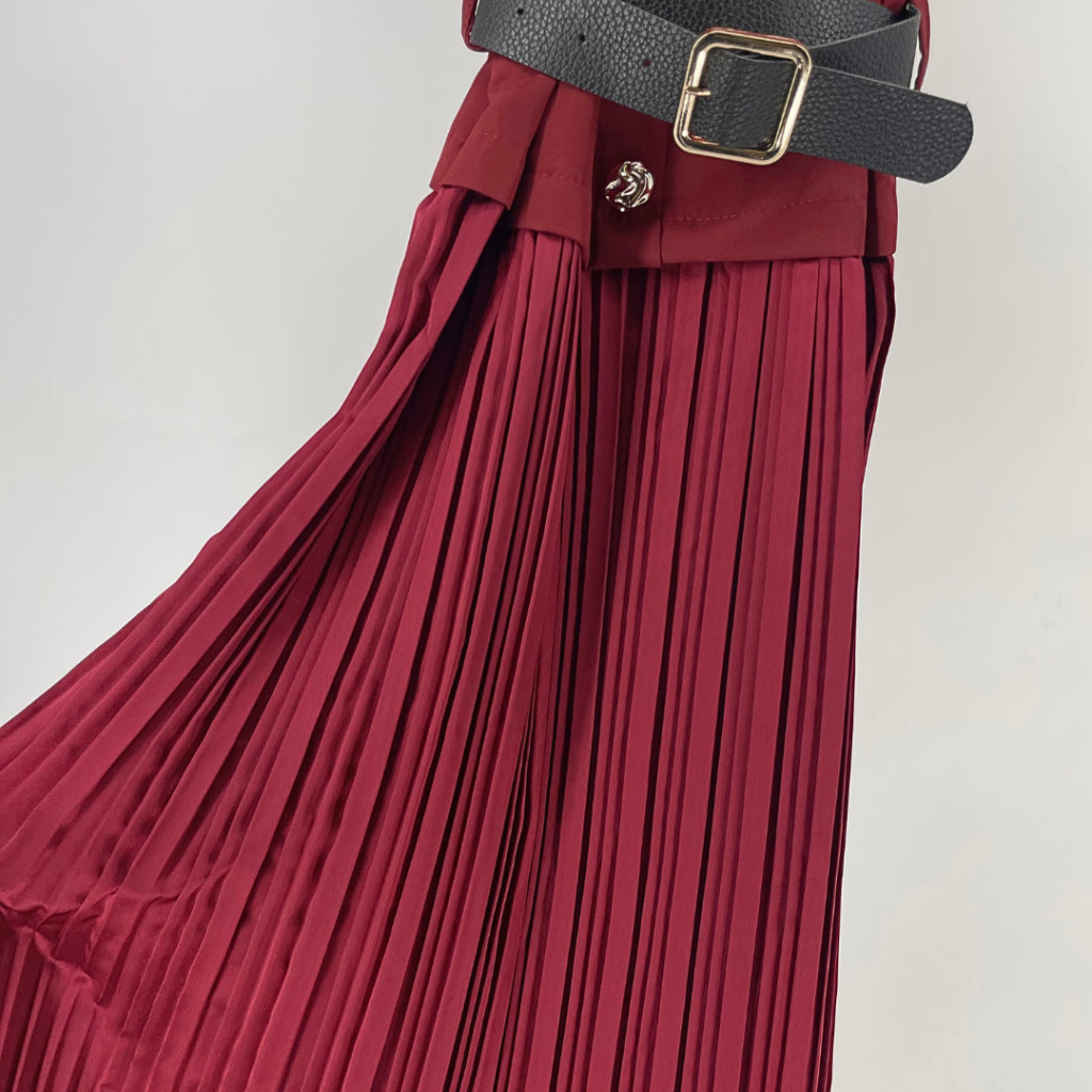 Ez a burgundi színű, pliszírozott alkalmi ruha kifinomult és nőies választás különleges alkalmakra. A felsőrész karcsúsított szabása szépen formálja a sziluettet, míg az alsó, finoman pliszírozott szoknyarész elegáns mozgást és légies megjelenést biztosít.