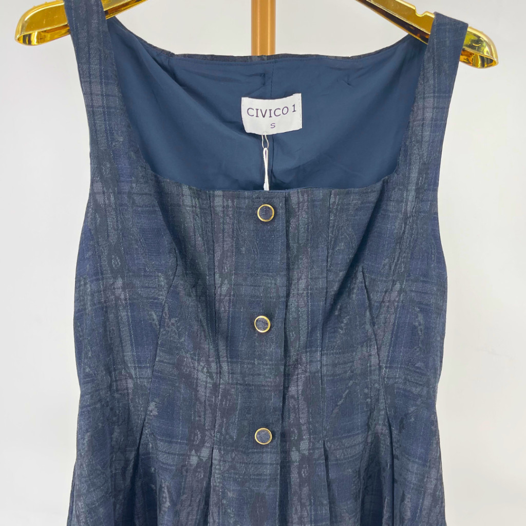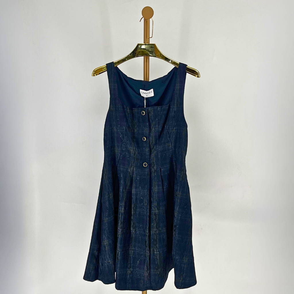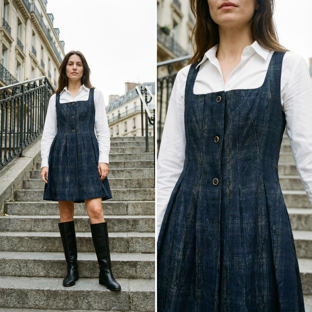 Ez a ruha a visszafogott elegancia és a kényelmes hétköznapi viselet tökéletes találkozása. A felsőrész enyhén karcsúsított, a szoknyarész pedig A-vonalban lágyan bővül, így előnyös sziluettet ad. Az elöl futó díszgombok elegáns részletet visznek a letisztult fazonba.