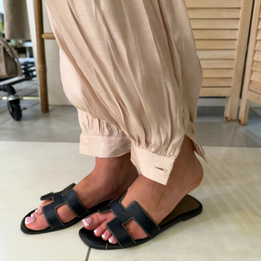 A nadrág ballonos szabású, amely az alján található gombos kialakítással záródik, így egyedi és divatos sziluettet hoz létre. Az elöl elhelyezett zsebek praktikusak és még kényelmesebbé teszik a viseletet.