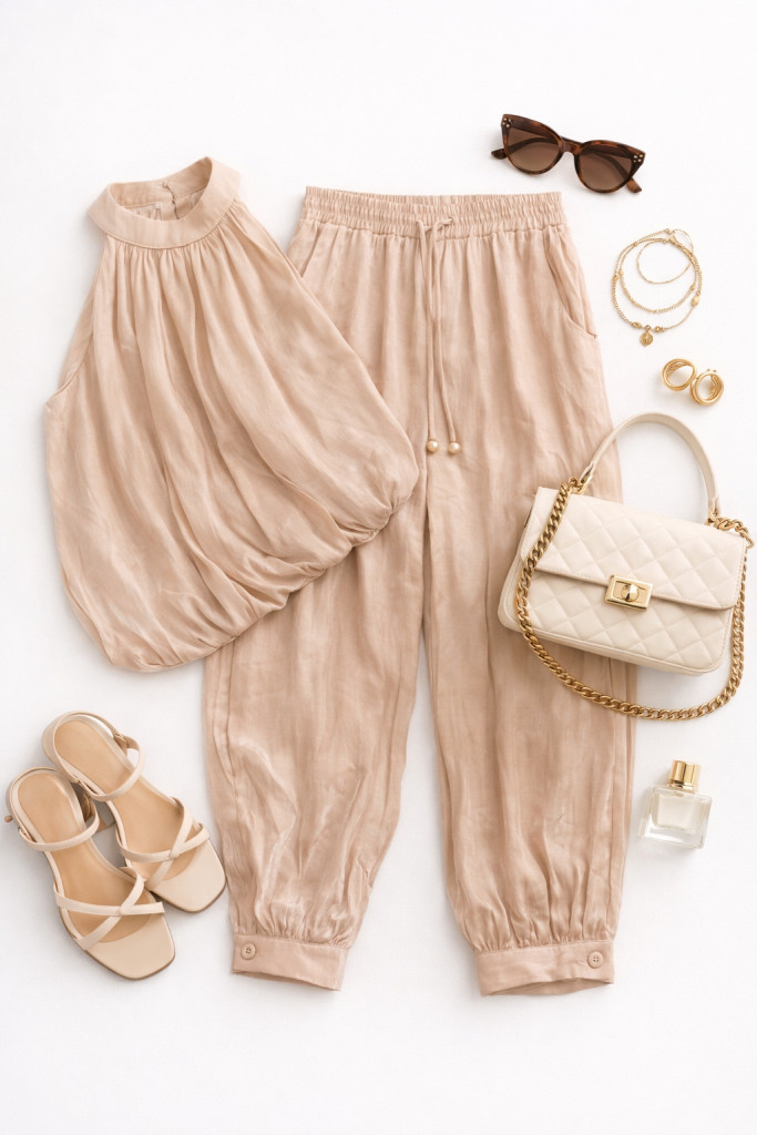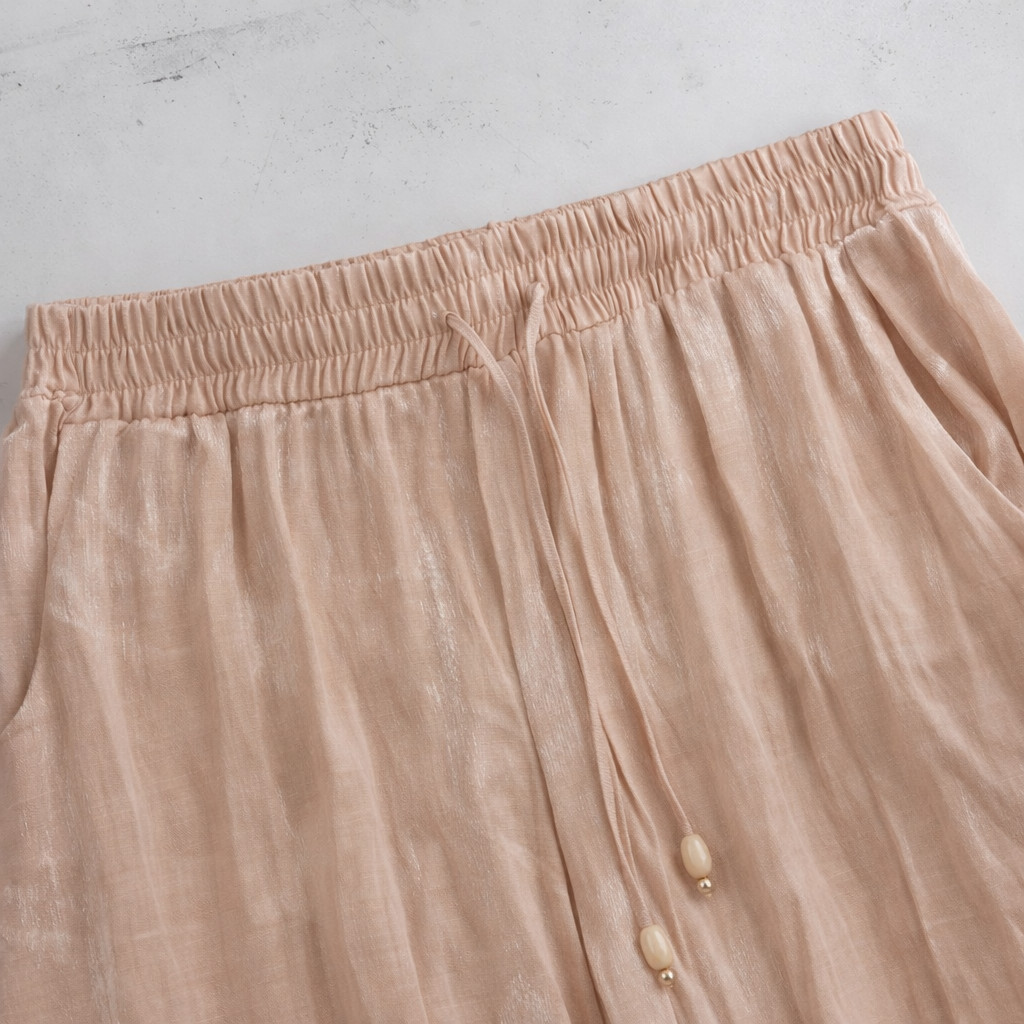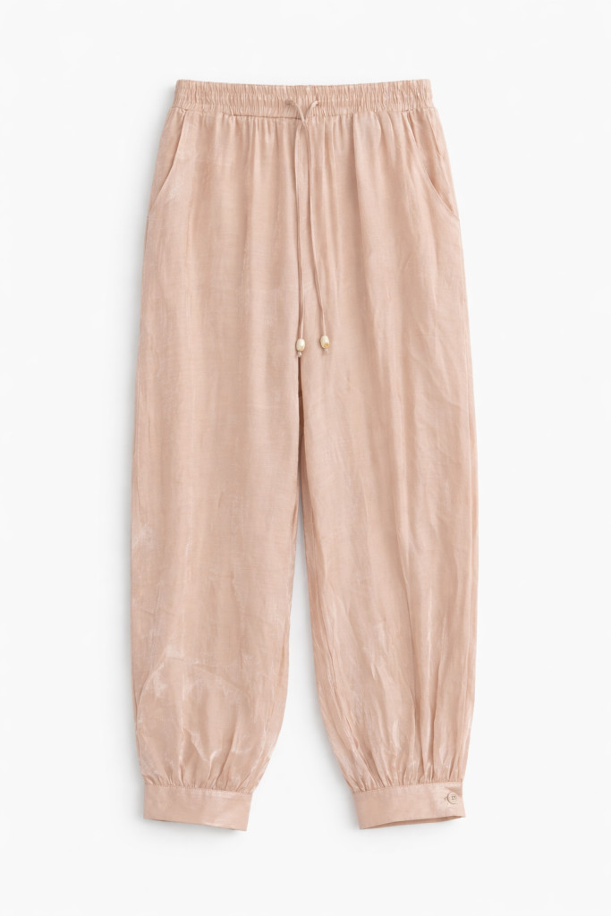 Ez a különleges fazonú nadrág a laza elegancia és a modern stílus tökéletes kombinációja. A magas fényű, lágy esésű anyag elegáns megjelenést ad, miközben a gumis derékrész kényelmes viseletet biztosít egész nap.