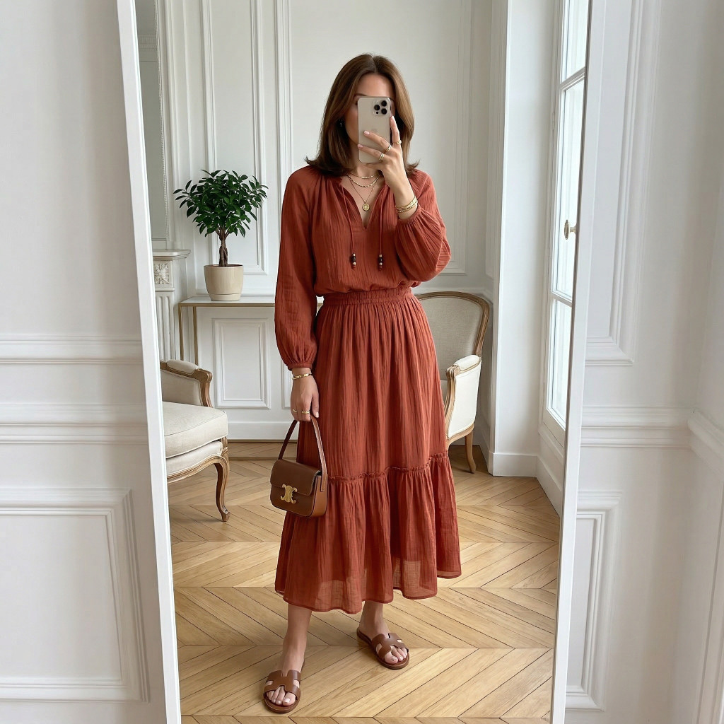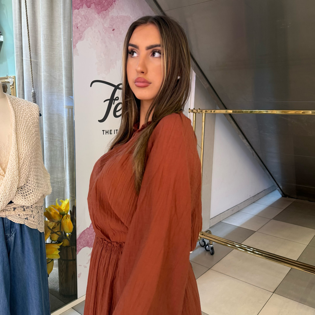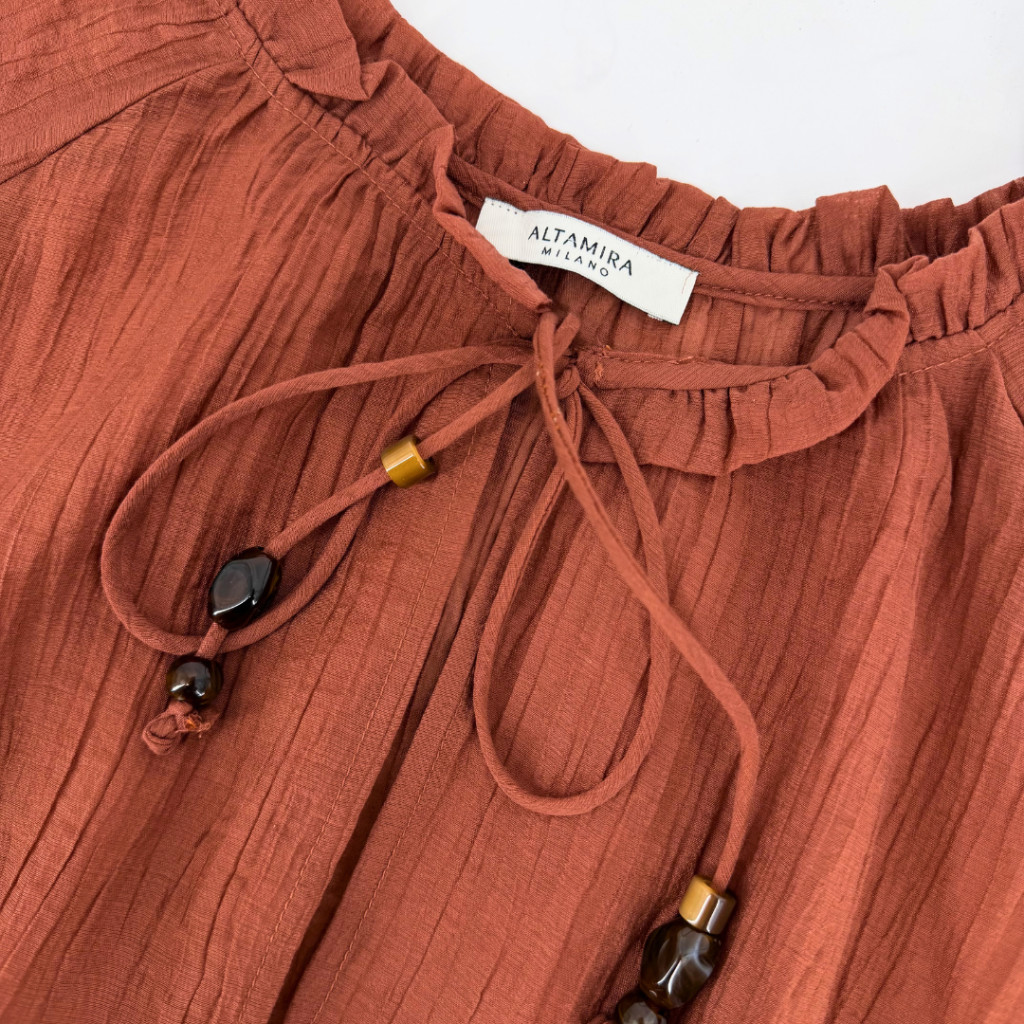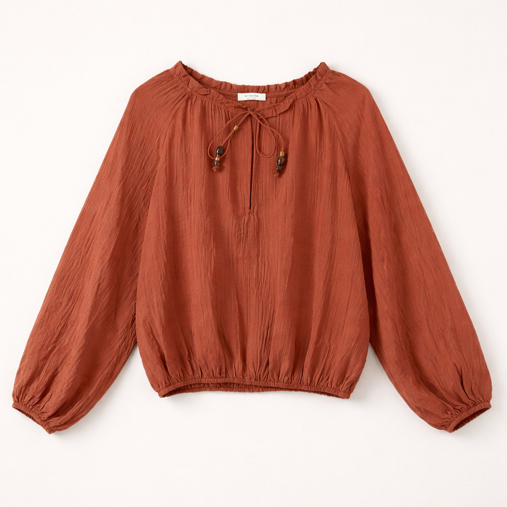 Ez a felső a könnyed, nőies stílus tökéletes megtestesítője. A finoman ráncolt nyakrész és a megkötős kialakítás romantikus hangulatot ad, míg a bő, lezser ujjak még légiesebbé teszik az összhatást.